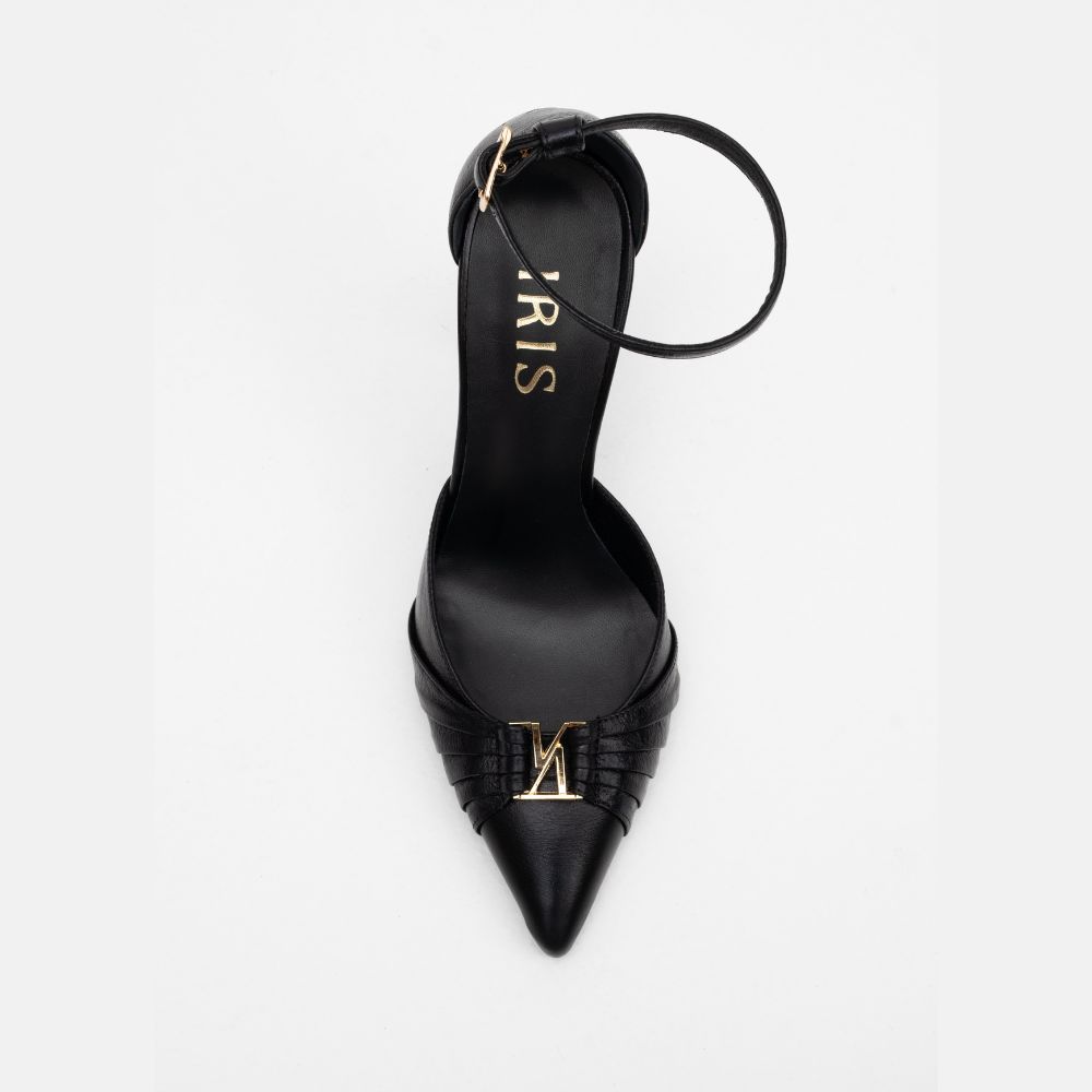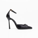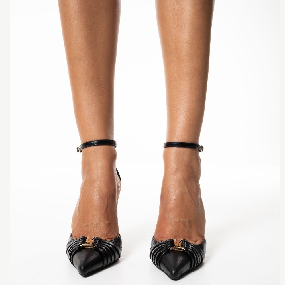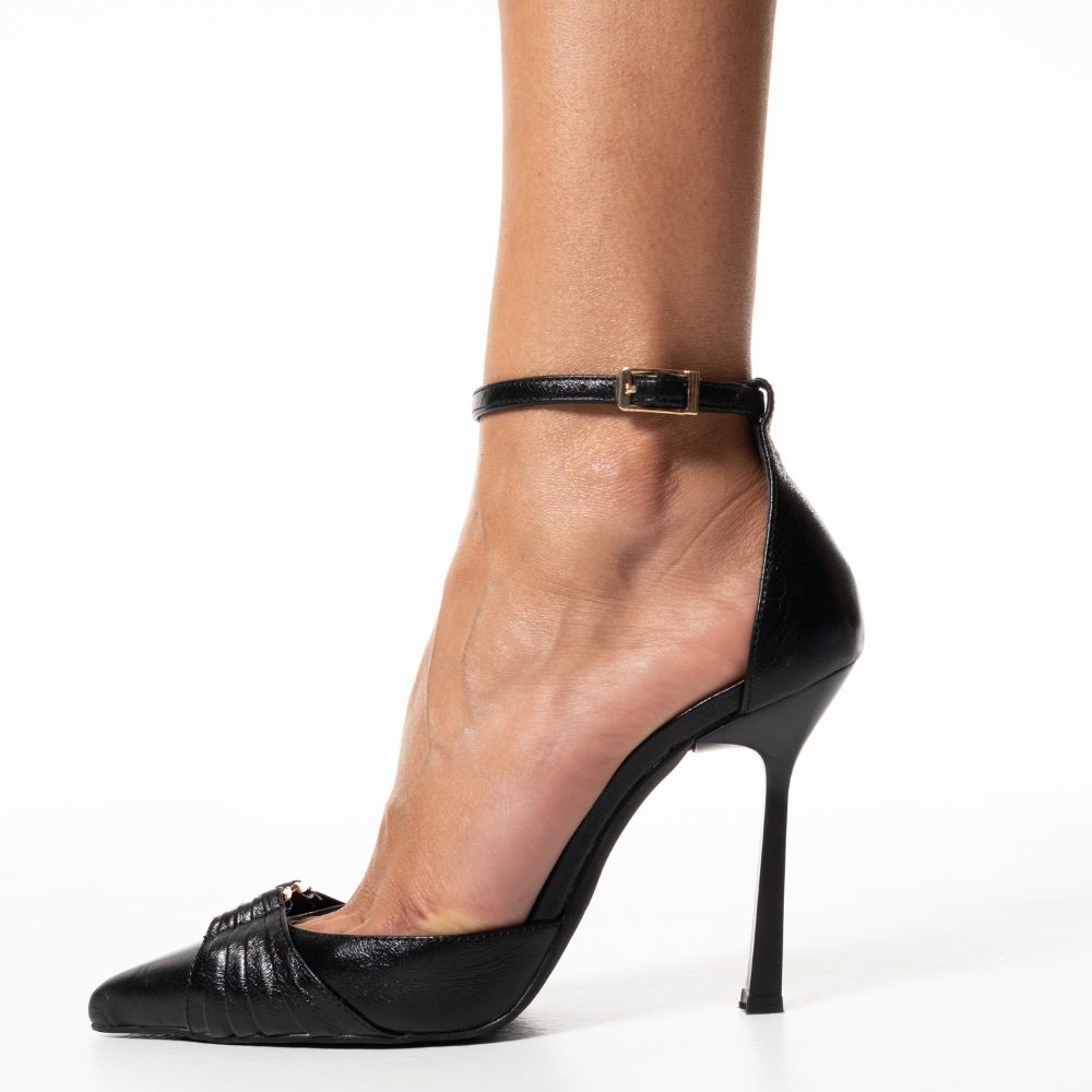 black leather high-heeled pumps with embellishment