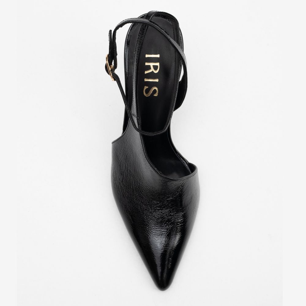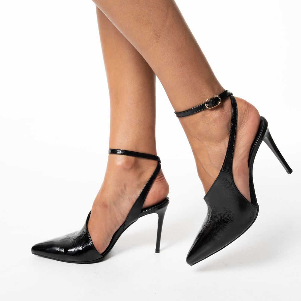 black patent leather slingback high-heel pumps