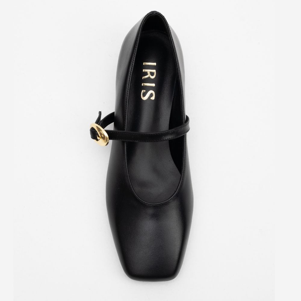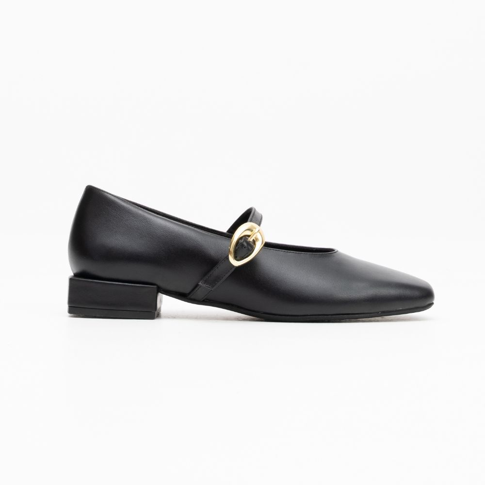 Leather square-toe ballet flats with strap. Featuring a soft leather insole, a square-shaped design, and a modern low heel. A distinctive style suitable for all occasions.