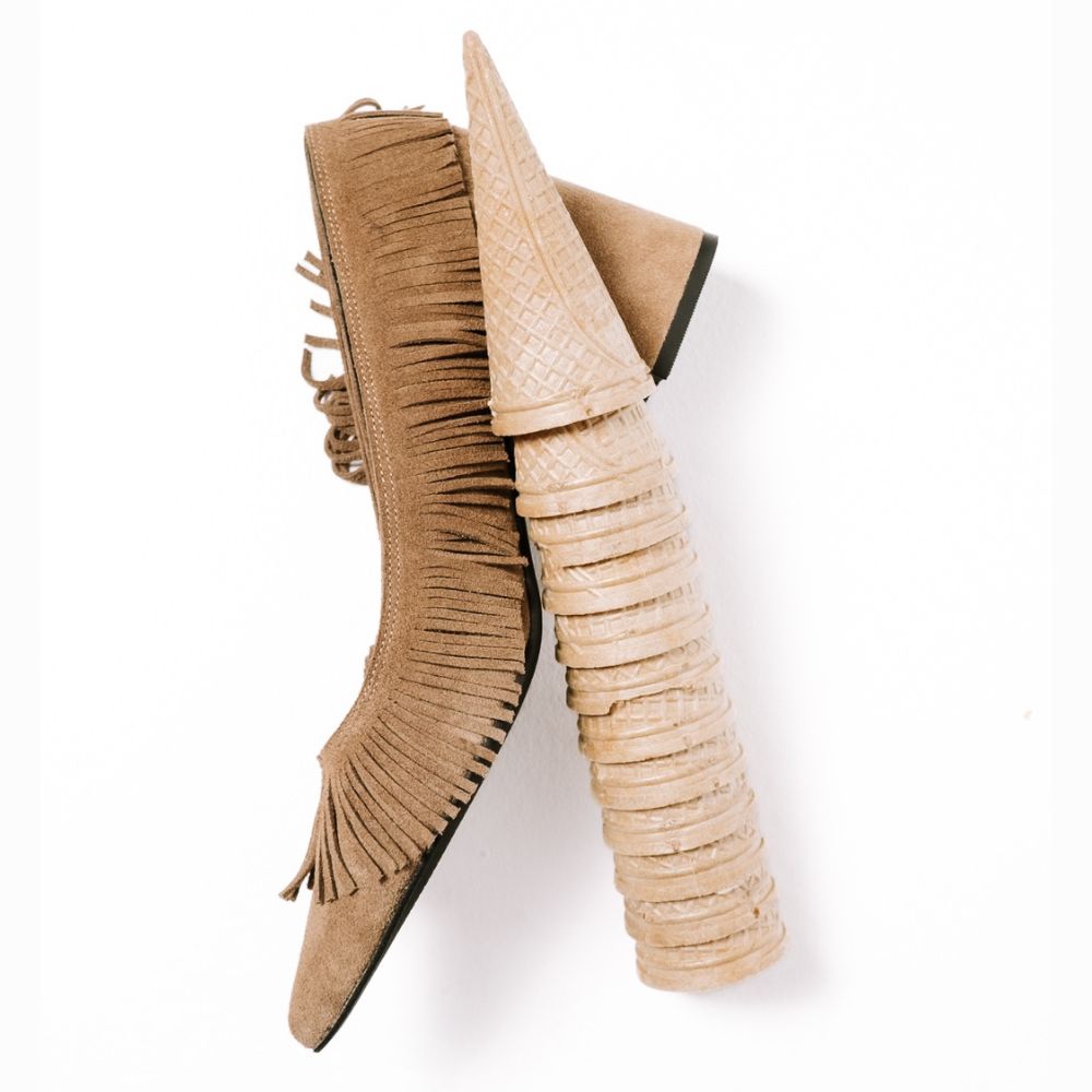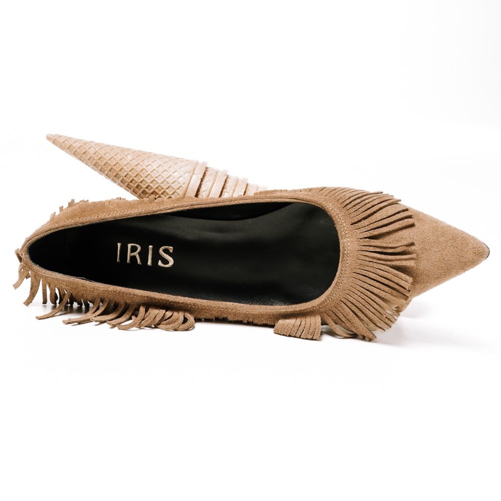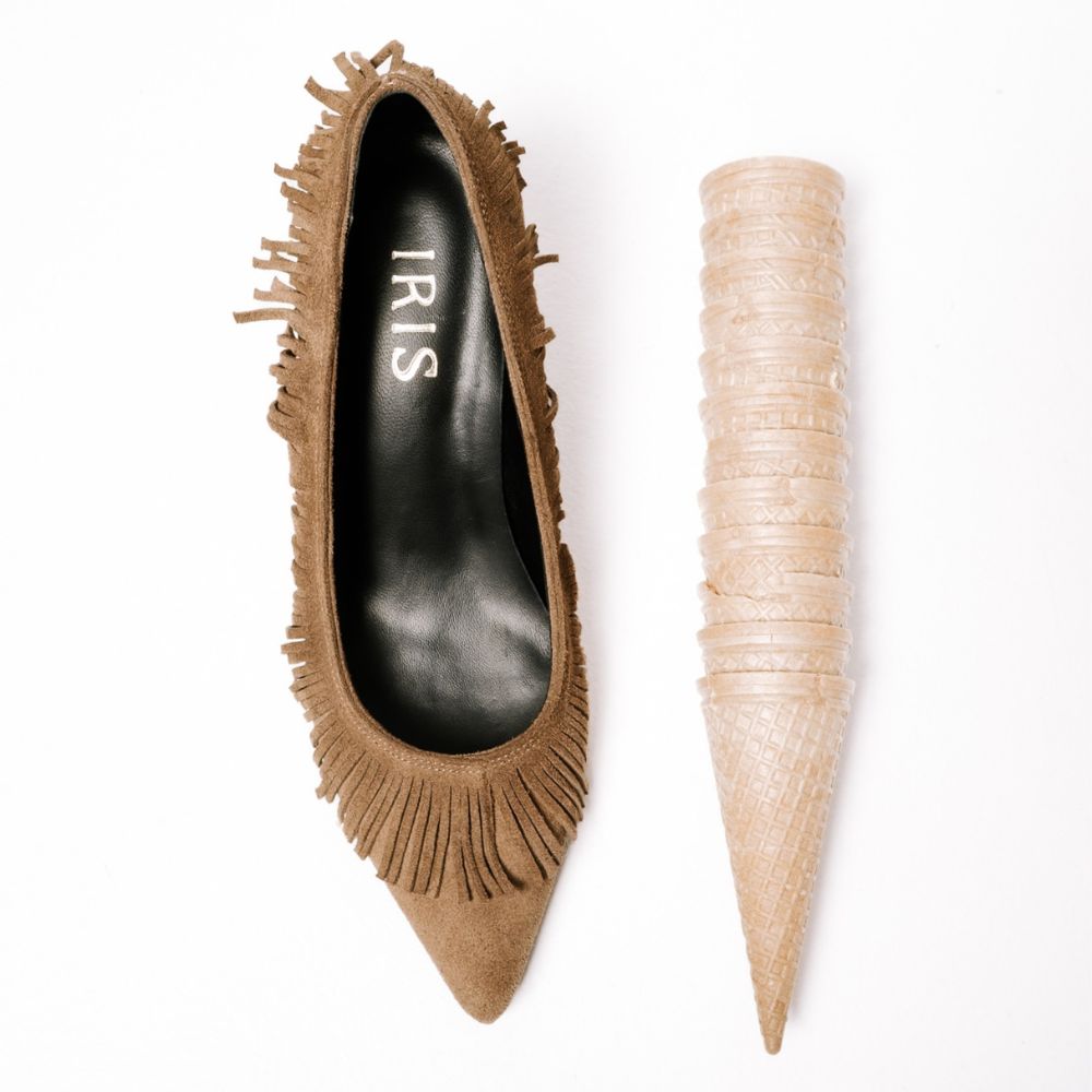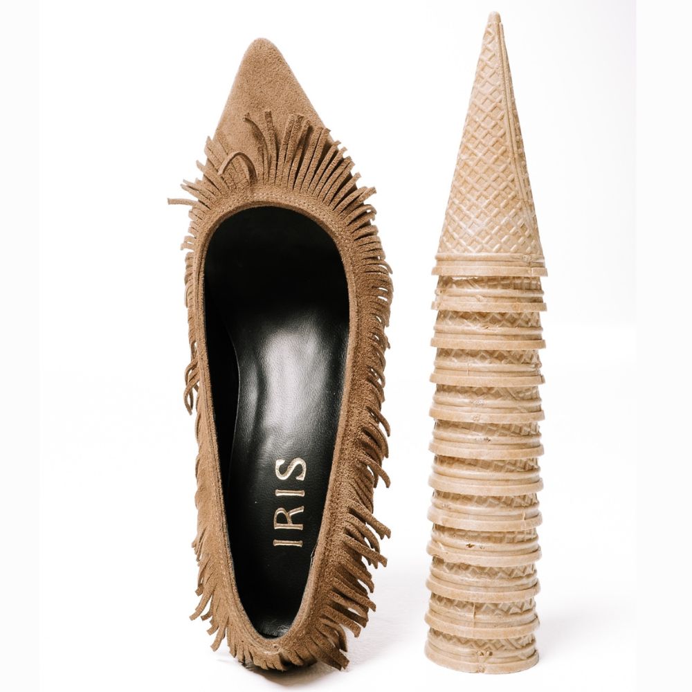 Suede pumps with decorative fringes and a medium block heel. Features a pointed toe.