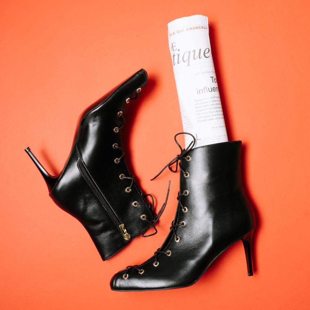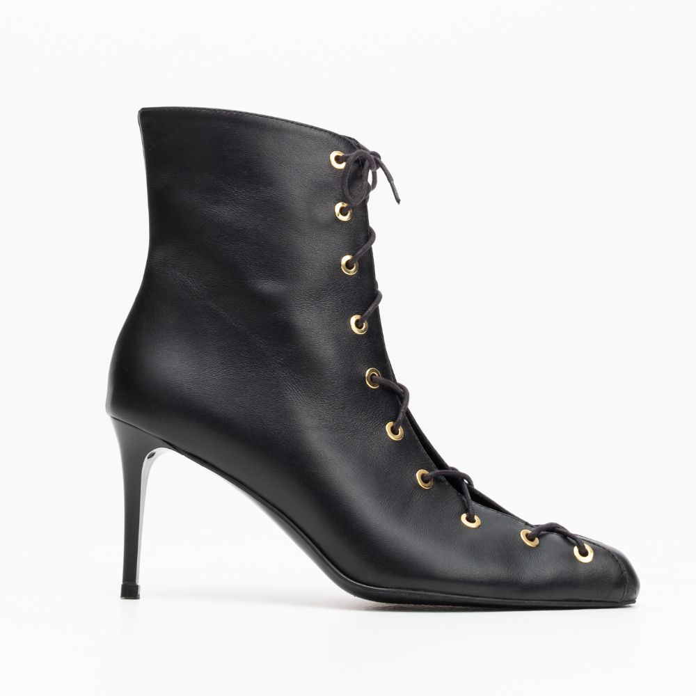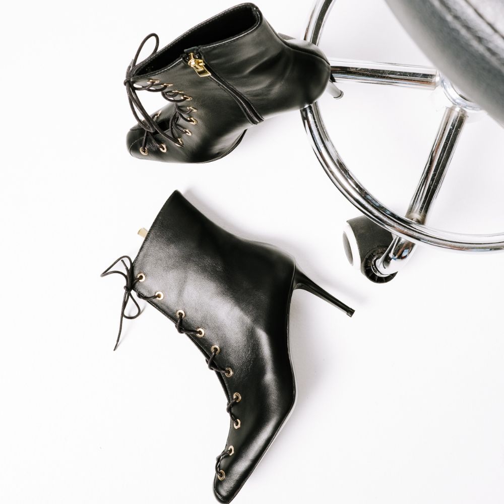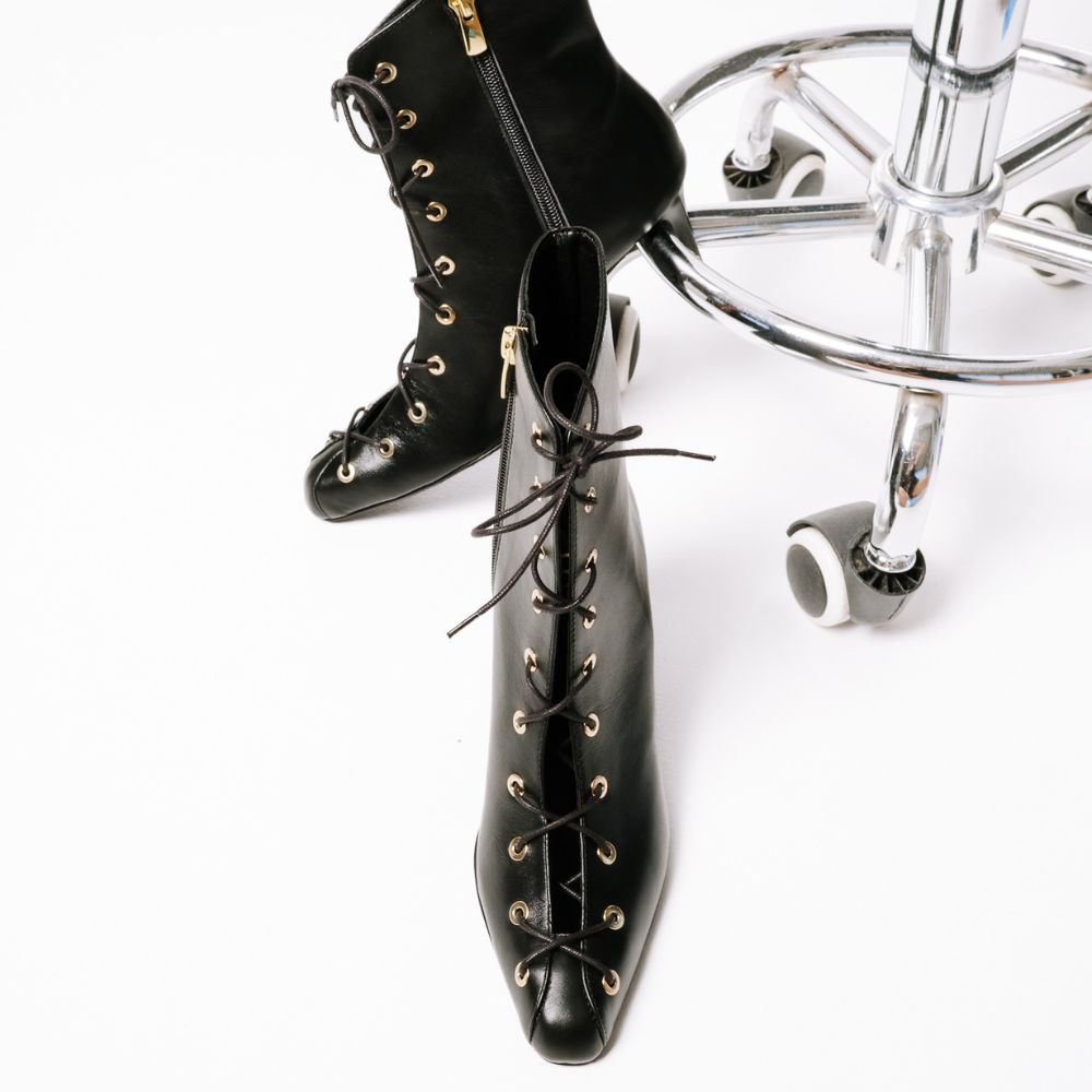 μαύρα δερμάτινα μποτάκια με δεσίματα και ψηλό ίσιο τακούνι