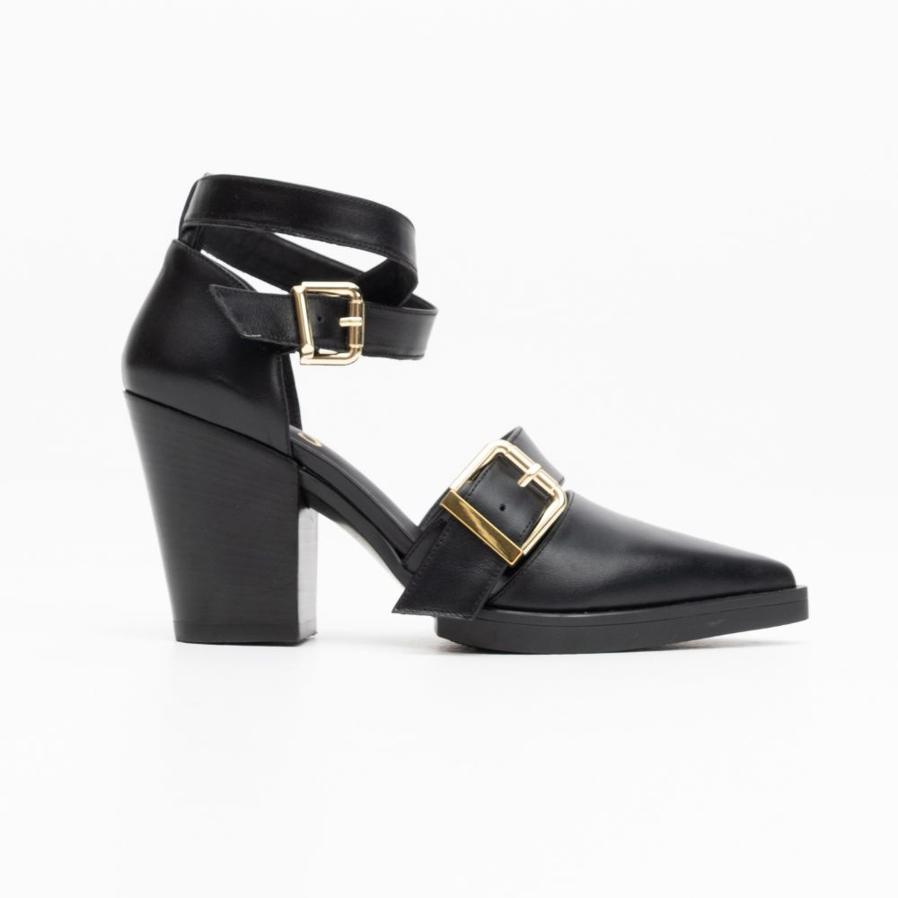 Γόβες κοφτές δερμάτινες με εντυπωσιακούς διακοσμητικούς τοκάδες. WESTERN style, με λουράκι στον αστράγαλο, μαλακό πάτο και χοντρό σταθερό τακούνι. Ένα πολύ ιδιαίτερο κι όμορφο σχέδιο για δυναμικές casual εμφανίσεις.